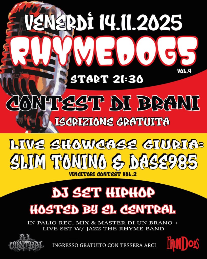 PREMI: Chi vincerà il contest avrà la possibilità di registrare un proprio pezzo presso El Central studio, a Savona, e riceverne il mix e master. In più avrà la possibilità di portare insieme ai musicisti del Jazz The Rhyme (evento che unisce Rap e musica funk/jazz suonata dal vivo) un live con band alla successiva edizione dello stesso che si terrà al Raindogs House (SV) questa stagione. NB: il Jazz The Rhyme nasce e si svolge come Open Mic suonato, ma il vincitore del Rhymedogs Contest otterrà uno spazio più consistente all’interno della serata in cui potrà eseguire un numero di brani accordato coi musicisti che suoneranno i beat in base alle esigenze artistico/musicali della/del rapper.